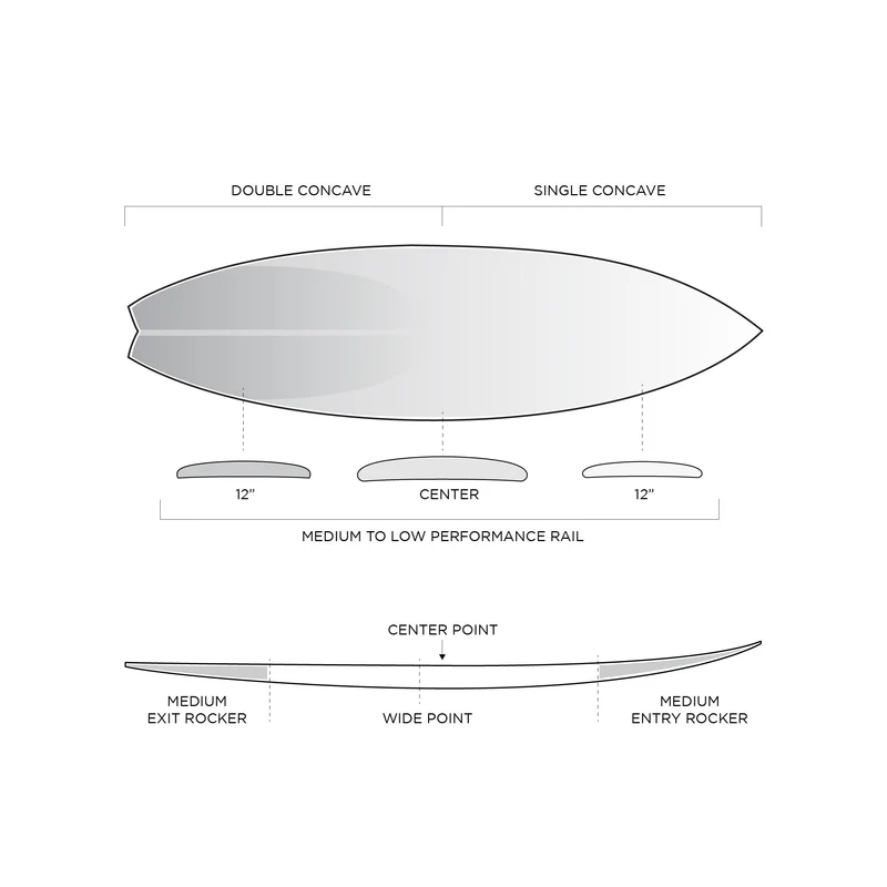 In addition to the new swallow tail design, Dan placed an emphasis on better distributing the volume directly between the surfer’s stance and worked with Kelly to amplify the effect of the outline in the back third of the board against all-new rocker curves – both down the shape’s centerline and on its rails. By specifically perfecting the curve at the board’s center when compared with the curve at the rails, the FRK Swallow excels at creating speed in flat, sticky sections, without sacrificing on-rail performance.